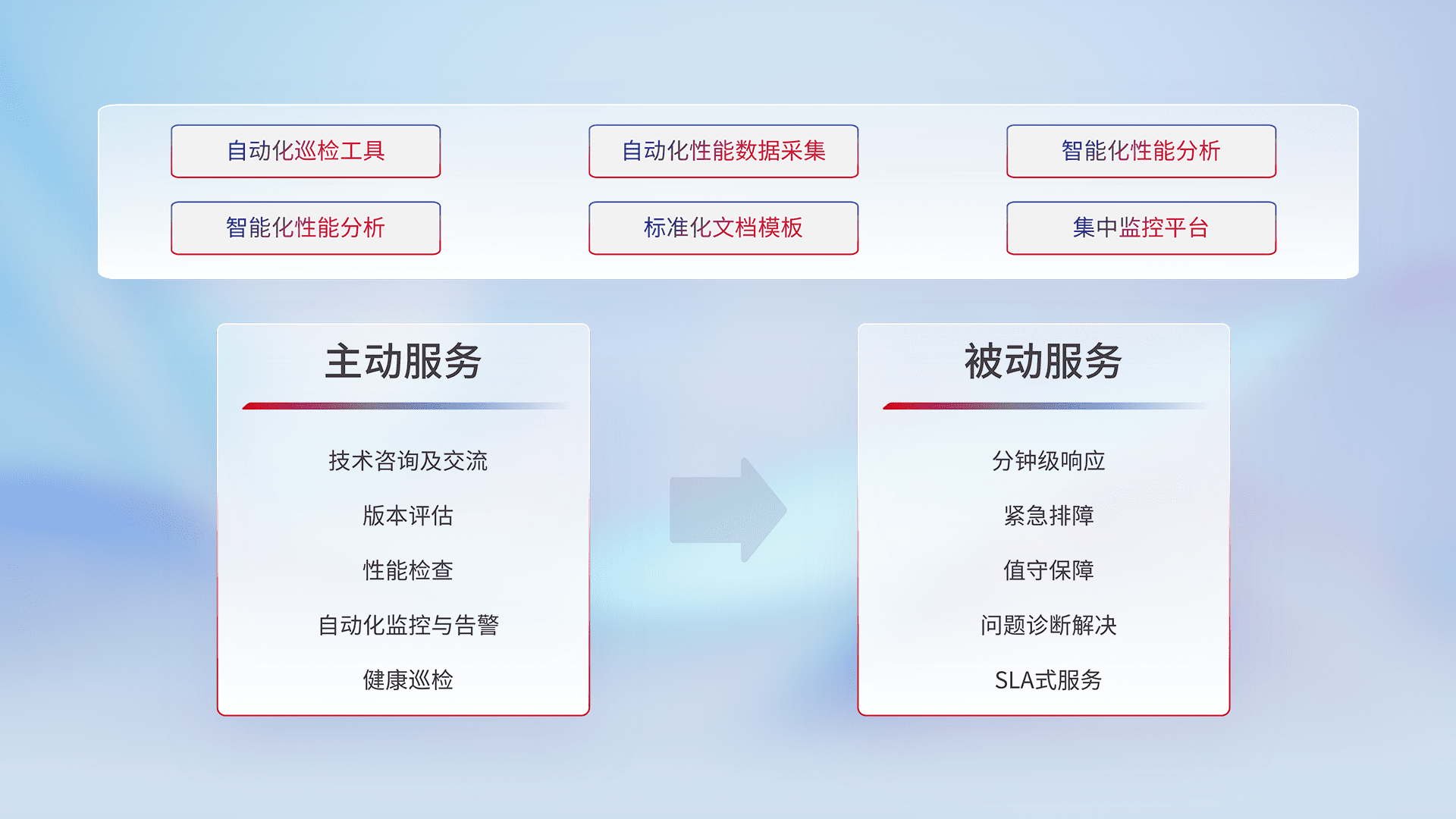 智能化工具和标准化文档,,,,保障服务质量,,,提供主动服务(包含技术咨询、、、、版本评估、、、性能检查、、、、自动化监控与告警、、、、健康巡检)和被动服务包含(分钟级响应、、、紧急排障、、、值守保障、、问题诊断解决、、、、SLA服务)。。。