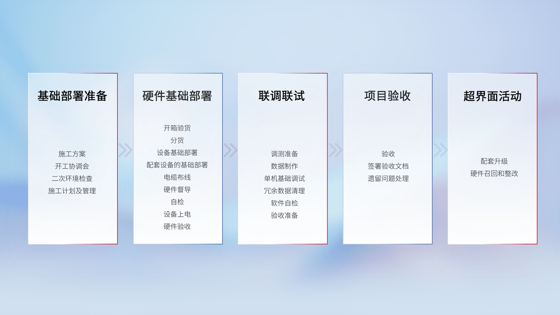 从基础部署准备、、、硬件基础部署、、、、联调联试、、、、项目验收、、、越界面活动的全过程可追溯,,保证施工质量和进度。。